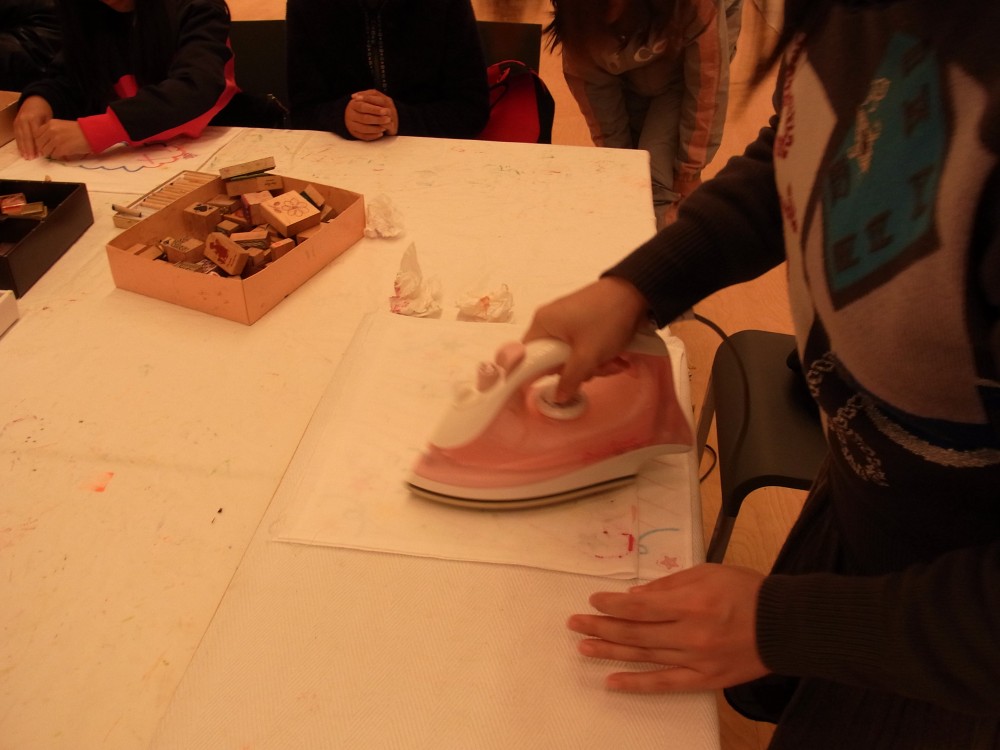 「ガーゼハンカチづくり」はガーゼのハンカチにゴムのスタンプや布用のクレヨンで絵を描き、それをアイロンの熱で固着させるというもの。3人の利用者の方が役割を分担して、体験者の手伝いをしています。子どもたちだけでなく、障がい者当事者の方も体験に参加されていましたが、このコーナーのまとめ役的な利用者の方が丁寧に根気よく対応していました。その様子をみると、なるほど、就労の一つの形として「ピアヘルパー(当事者が当事者の支援をする)」のイメージが想像できました。